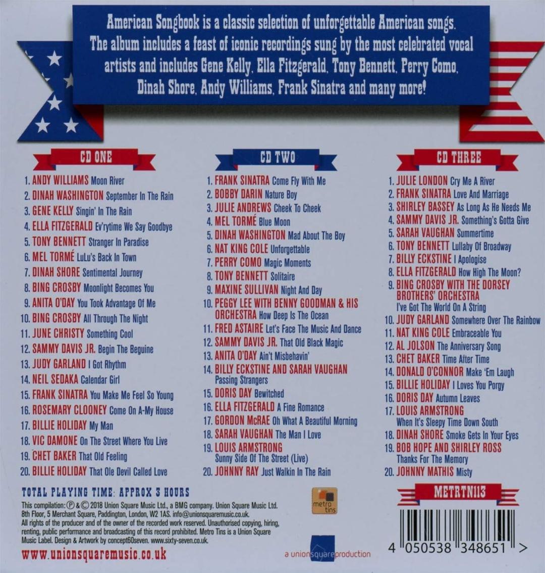 American Songbook is a classic selection of unforgettable American songs. The album includes a feast of iconic recordings sung by the most celebrated vocal artists and includes Gene Kelly, Ella Fitzgerald, Tony Bennett, Perry Como, Dinah Shore, Andy Williams, Frank Sinatra and many more!